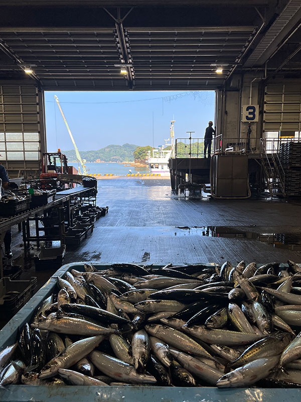 選別された魚は、きれいにカゴに並べられますが、魚を床に並べずにカゴを使うのは衛生面を考えてのことです。