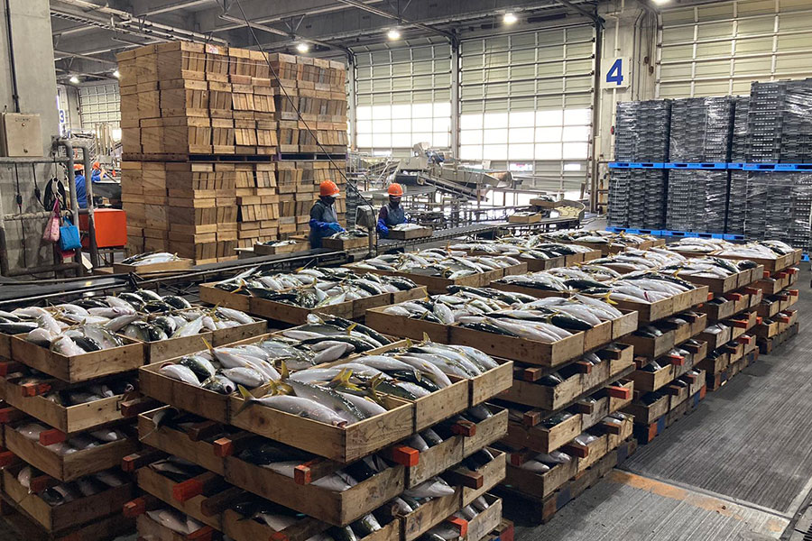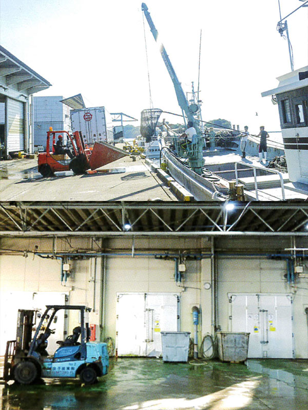 日本全国の魚市場から仕入れ、現地で立替し、各地にある施設の中で最も近い冷蔵庫にて凍結する。